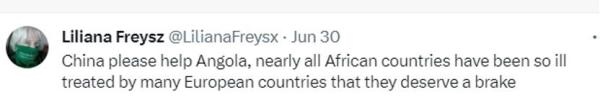 網(wǎng)友利利安娜·弗賴斯直呼:“中國(guó)請(qǐng)幫助安哥拉,幾乎所有非洲國(guó)家都忍受過(guò)歐洲國(guó)家的糟糕對(duì)待,它們?cè)撚瓉?lái)轉(zhuǎn)機(jī)了。”