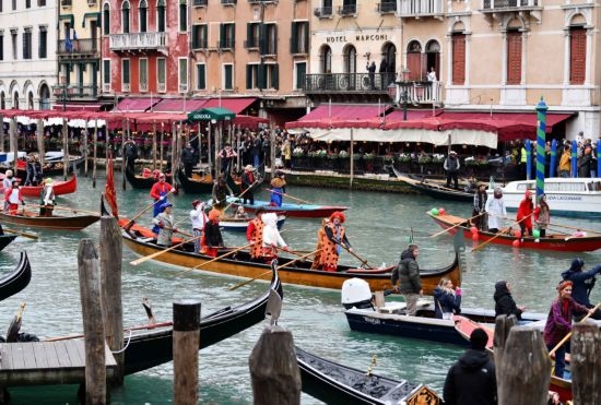 今年2月5日,人們在意大利威尼斯參加花船游行。(新華社記者金馬夢妮攝)