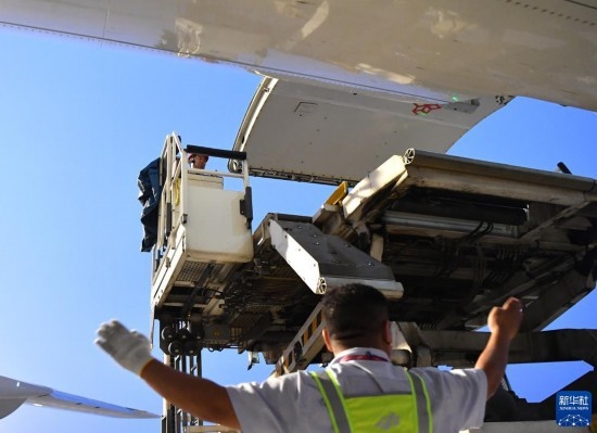 8月1日,在中國(guó)鄭州新鄭國(guó)際機(jī)場(chǎng),工作人員駕駛新能源拖車(chē)為一架盧森堡貨航貨機(jī)卸貨。新華社記者 李嘉南 攝