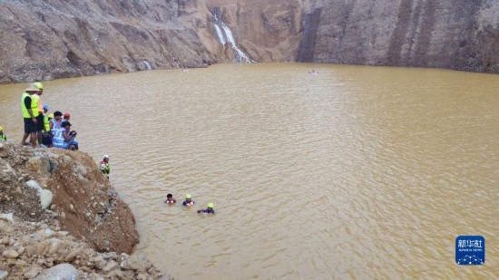 從事故現(xiàn)場發(fā)回的照片和視頻看,救援和遺體搜尋工作主要在坍塌礦區(qū)的堰塞湖進行。