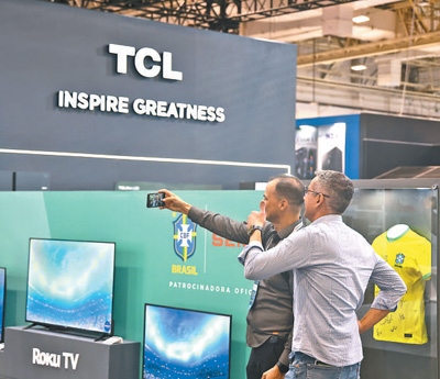 在2023年圣保羅國際消費(fèi)類電子及家用電器產(chǎn)品展覽會上,參觀者在TCL展臺前合影留念。本報(bào)記者 時元皓攝