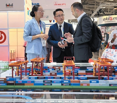 在2023年慕尼黑國際物流博覽會上,工作人員在中鐵集裝箱運輸有限公司展臺前向國外客戶介紹廣州國際港中歐班列站點設施。本報記者 李 強攝