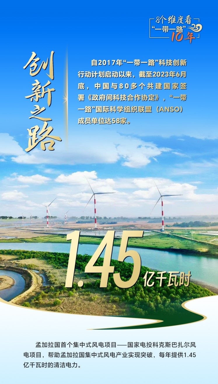 10年來(lái),創(chuàng)新始終是一個(gè)關(guān)鍵詞,中國(guó)與共建國(guó)家加強(qiáng)科技創(chuàng)新合作,加速集聚創(chuàng)新資源,為共建“一帶一路”注入強(qiáng)勁動(dòng)力。截至2023年6月底,中國(guó)與80多個(gè)共建國(guó)家簽署《政府間科技合作協(xié)定》,“一帶一路”國(guó)際科學(xué)組織聯(lián)盟(ANSO)成員單位達(dá)58家;2013年以來(lái),中國(guó)支持逾萬(wàn)名共建國(guó)家青年科學(xué)家來(lái)華開展短期科研工作和交流,累計(jì)培訓(xùn)共建國(guó)家技術(shù)和管理人員1.6萬(wàn)余人次;累計(jì)幫助50多個(gè)非洲國(guó)家建成20多個(gè)農(nóng)業(yè)技術(shù)示范中心,在農(nóng)業(yè)、新能源、衛(wèi)生健康等領(lǐng)域啟動(dòng)建設(shè)50余家“一帶一路”聯(lián)合實(shí)驗(yàn)室。