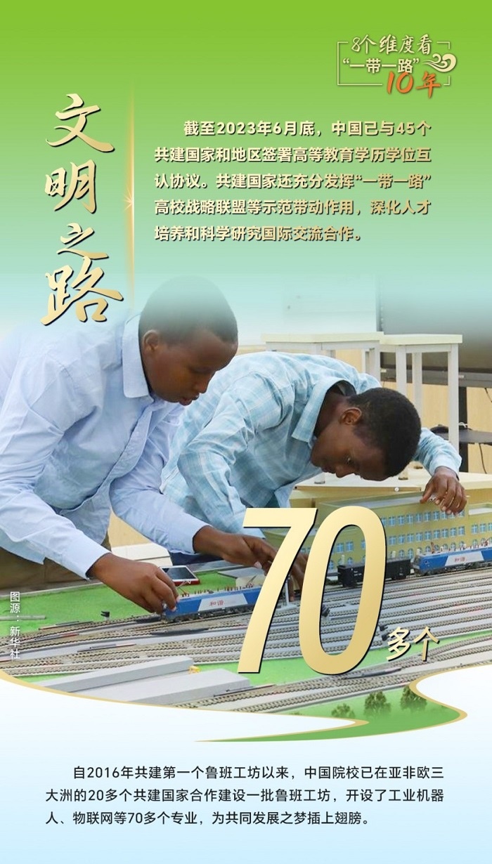 文明因交流而多彩,因互鑒而豐富。作為“一帶一路”的倡導(dǎo)者和推動(dòng)者,中國(guó)也成為促進(jìn)世界文明交流互鑒的先行者和示范者。截至2023年6月底,中國(guó)已與45個(gè)共建國(guó)家和地區(qū)簽署高等教育學(xué)歷學(xué)位互認(rèn)協(xié)議。中國(guó)院校在132個(gè)共建國(guó)家辦有313所孔子學(xué)院、315所孔子課堂;“漢語(yǔ)橋”夏令營(yíng)項(xiàng)目累計(jì)邀請(qǐng)100余個(gè)共建國(guó)家近5萬(wàn)名青少年來(lái)華訪學(xué),支持143個(gè)共建國(guó)家10萬(wàn)名中文愛(ài)好者線上學(xué)習(xí)中文、體驗(yàn)中國(guó)文化。
