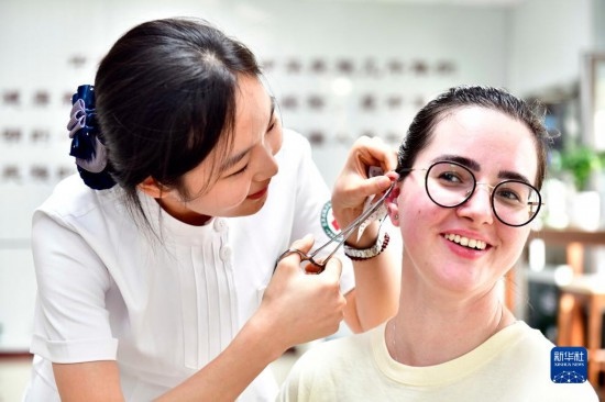 10月18日,在青島西海岸新區(qū)中醫(yī)醫(yī)院,山東科技大學(xué)國際交流學(xué)院斯洛伐克籍留學(xué)生夢娜在體驗中醫(yī)傳統(tǒng)療法耳穴壓丸。