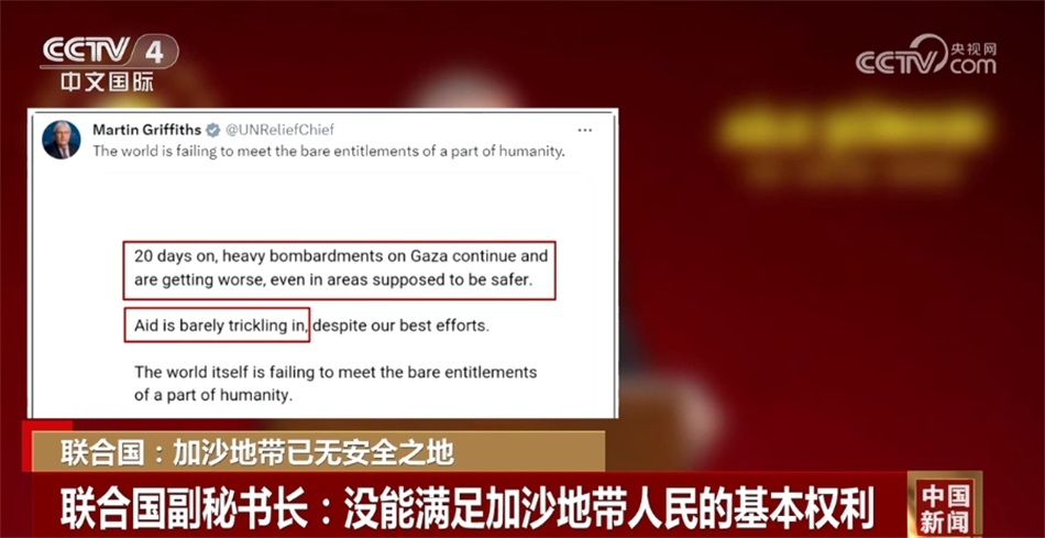 同一天,聯合國分管人道主義事務的副秘書長馬丁·格里菲斯在社交媒體發(fā)文稱,在過去20天里,對加沙地帶的猛烈轟炸愈發(fā)嚴重,一些本該安全的地區(qū)也已經陷入危險,但援助物資卻很難進入加沙地帶,國際社會沒能滿足一部分人的基本權利。