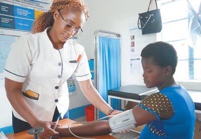 穆薩烏(左)為一名當(dāng)?shù)卦袐D測量血壓。本報記者 黃煒鑫攝
