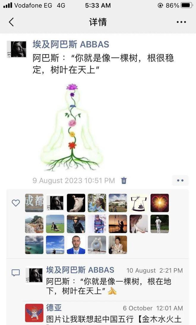 “你就是像一棵樹(shù),根很穩(wěn)定,樹(shù)葉在天上?!边@是阿巴斯微信朋友圈里的一句話,也是他生活和工作的寫(xiě)照。那深入泥土的遒勁的“根”,是他對(duì)中文和中國(guó)文化的不斷深入學(xué)習(xí),是不斷發(fā)展的中埃友誼,是不斷走深走實(shí)的共建“一帶一路”倡議;那姿態(tài)昂揚(yáng)、伸向天空的輕盈的“葉”,是他由“小我”走向“大我”穩(wěn)步實(shí)現(xiàn)的夢(mèng)想,是他對(duì)更美好明天的熱切期待。