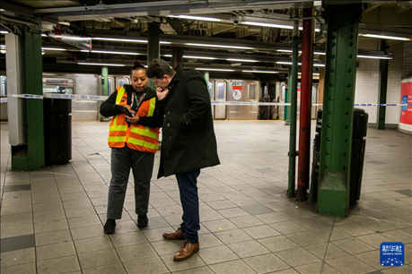 1月4日,在美國(guó)紐約,工作人員在地鐵站臺(tái)為乘客提供幫助。新華社發(fā)(郭克攝)