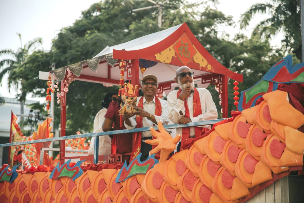 2月3日,在毛里求斯首都路易港,毛里求斯副總理胡斯努(左)參加花車(chē)巡游活動(dòng)。新華社發(fā)(中國(guó)駐毛里求斯大使館供圖)
