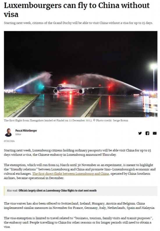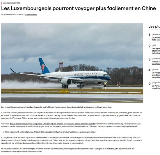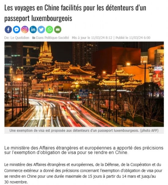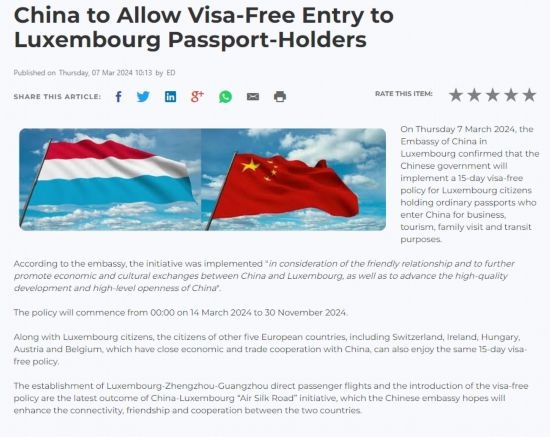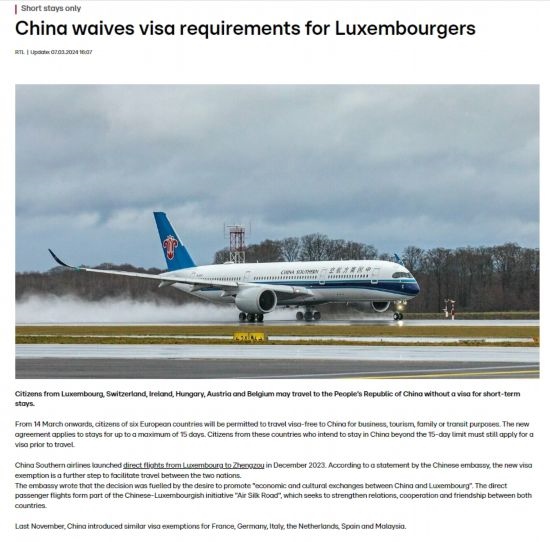 近日,中國政府決定自2024年3月14日0時起至2024年11月30日24時,對包括盧森堡在內(nèi)的6國持普通護(hù)照人員實行部分免簽。中國駐盧使館及時向盧外交部等部門和主流媒體作了通報,盧政府和媒體對中方免簽政策予以高度評價。