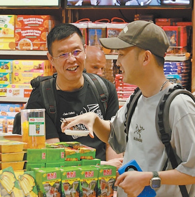 在泰國曼谷素萬那普機場免稅店,兩名中國游客正在購買當(dāng)?shù)靥厣a(chǎn)品。