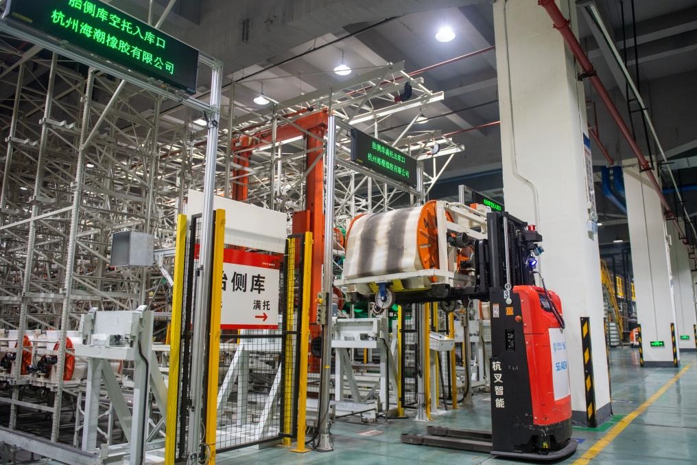 ?在杭州市錢塘區(qū)中策橡膠集團(tuán)股份有限公司未來工廠內(nèi),無人叉車在運(yùn)輸產(chǎn)品(2024年2月23日攝)。新華社記者 江漢 攝