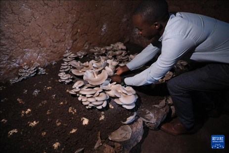 4月6日,在盧旺達南方省穆漢加市附近,尼揚博·奧貝德在工坊查看培育的蘑菇。 新華社記者 董江輝 攝