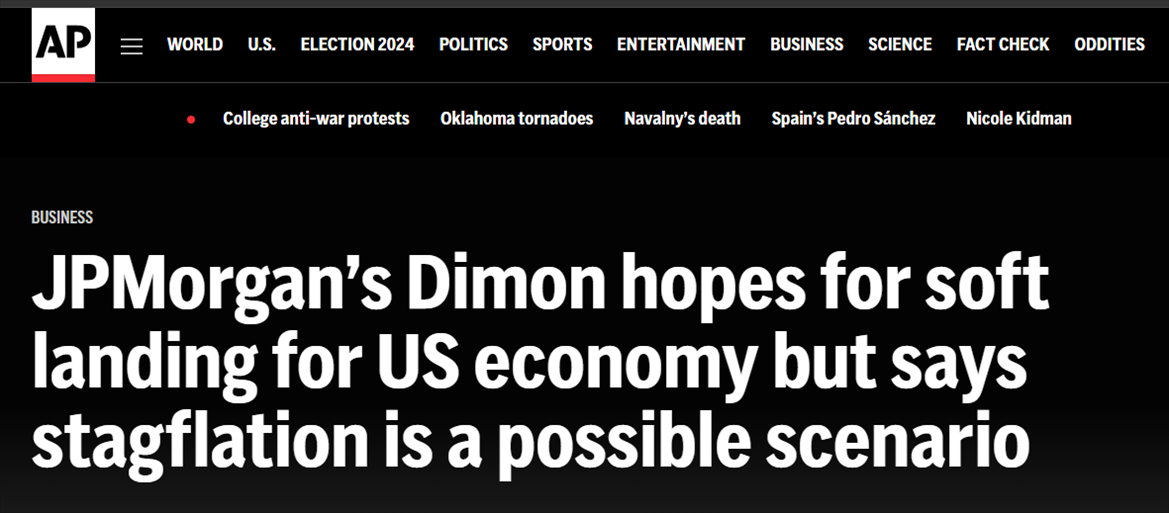 近日,摩根大通公司首席執(zhí)行官杰米·戴蒙在接受美聯(lián)社采訪時(shí)稱,他對(duì)美國經(jīng)濟(jì)仍保持“審慎”,并表示通脹可能會(huì)在更長(zhǎng)時(shí)間內(nèi)變得更棘手,“滯脹也可能是(美國經(jīng)濟(jì)面臨的)一種情況”。