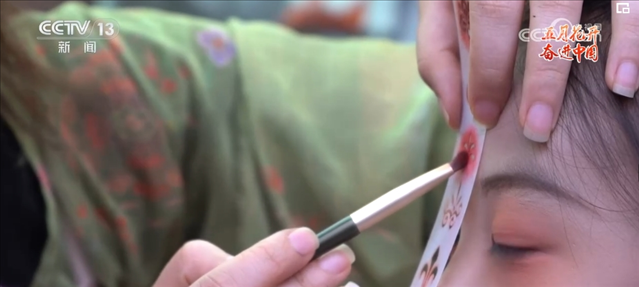 花鈿是古代女性在額頭部位點(diǎn)綴的一種花飾。現(xiàn)在的胡芯銀,不僅會根據(jù)顧客的年齡、臉型和服裝的樣式來搭配不同風(fēng)格的花鈿,還會給小姐姐們做一些傳統(tǒng)文化的講解。胡芯銀說,要想做得更好,就要多看多學(xué)。