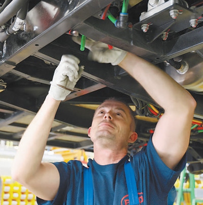 位于匈牙利科馬羅姆的比亞迪電動大巴工廠內(nèi),工人正在作業(yè)。本報(bào)記者 顏 歡攝