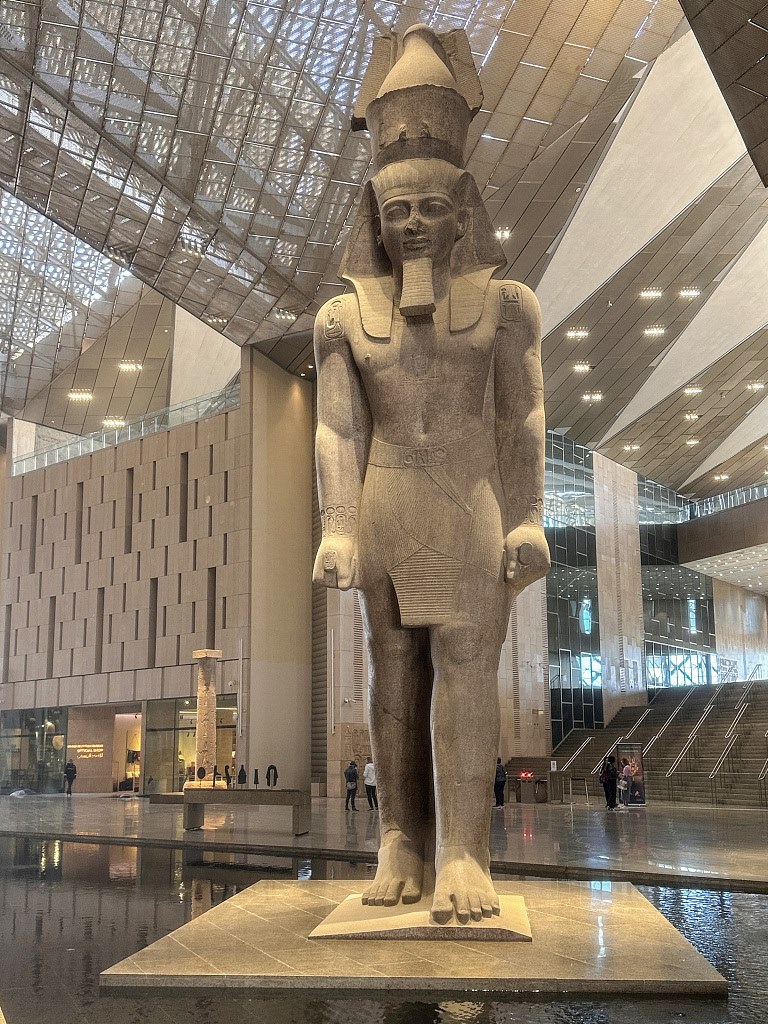 大埃及博物館蜿蜒于吉薩金字塔群側(cè)畔,場(chǎng)館將安置10萬余件埃及文物。從史前到希臘-羅馬時(shí)期,按年代順序陳列。其中最大的展品包括位于中庭的一尊高11米、重75噸的拉美西斯大帝紅色花崗巖雕像和一艘45米長(zhǎng)的木制“太陽船”,該船于1954年從胡夫金字塔底部坑穴發(fā)掘出土。