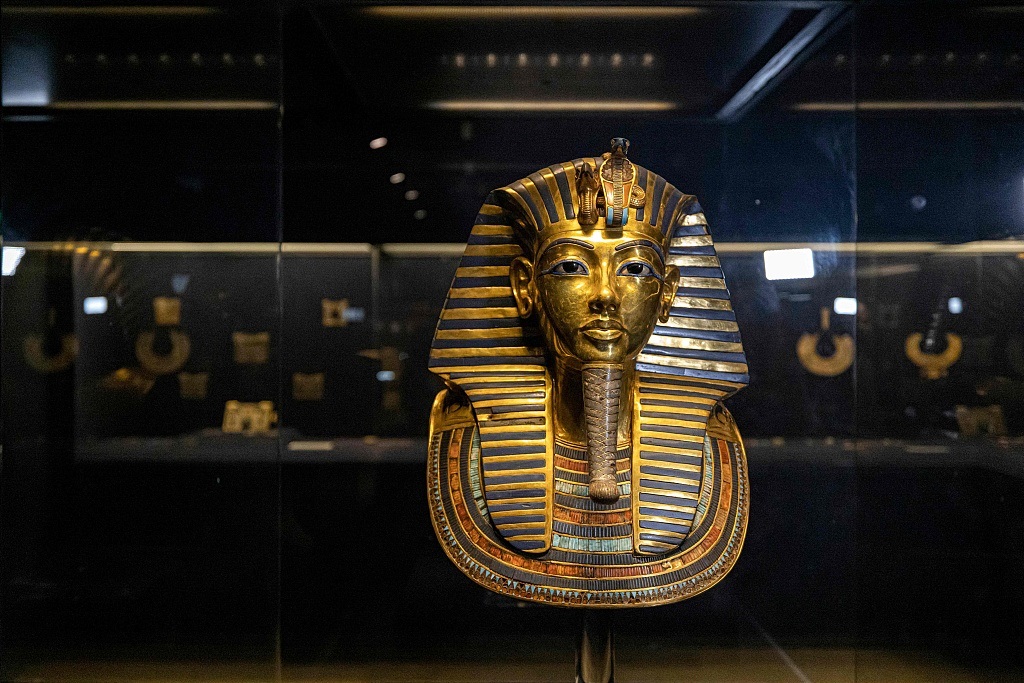 埃及博物館展出了古埃及新王國(guó)法老圖坦卡蒙(公元前1334-1325年)的黃金墓葬面具