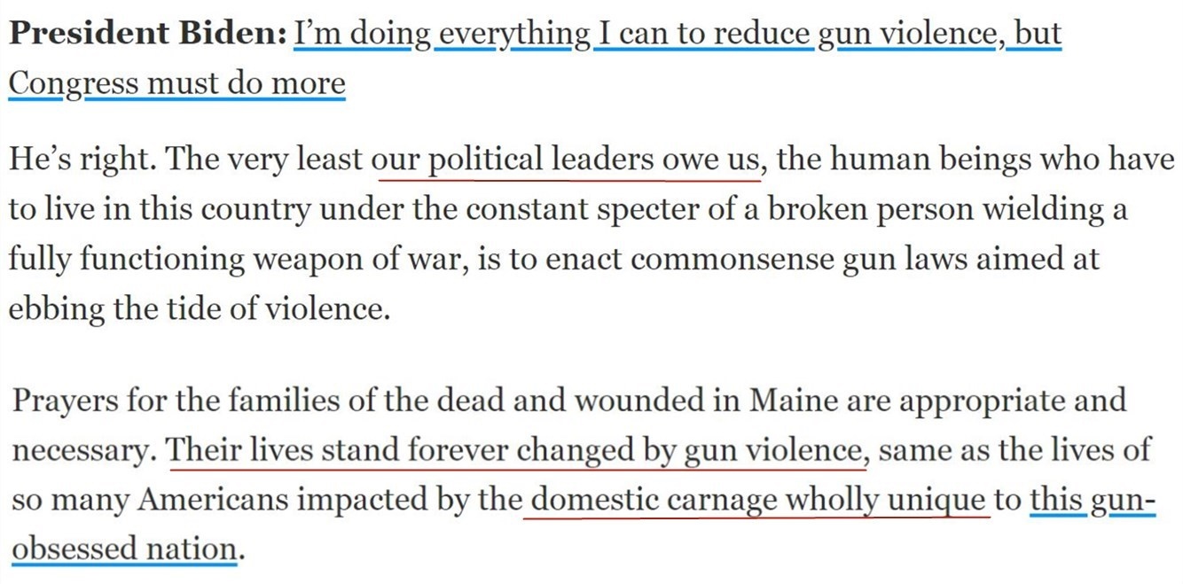 《今日美國(guó)報(bào)》曾評(píng)論說(shuō),美國(guó)至今沒(méi)有一部能夠遏制槍支暴力的有效控槍法案,“這是我們的政治領(lǐng)導(dǎo)人欠我們的”。