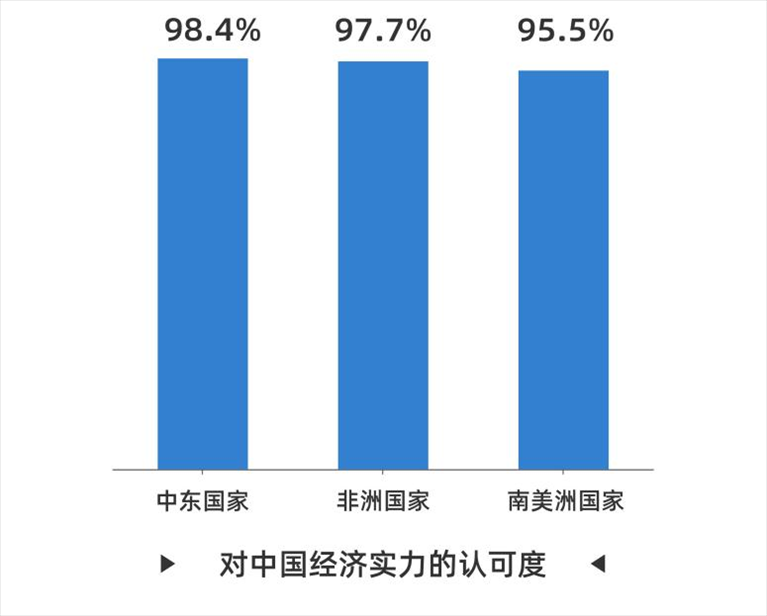 在經(jīng)濟(jì)表現(xiàn)方面,92.3%的受訪(fǎng)者稱(chēng)贊中國(guó)經(jīng)濟(jì)實(shí)力強(qiáng)勁,這一調(diào)查結(jié)果與去年基本持平。其中,中東國(guó)家受訪(fǎng)者的認(rèn)可度達(dá)到98.4%,非洲國(guó)家和南美洲國(guó)家受訪(fǎng)者的認(rèn)同度分別為97.7%和95.5%。