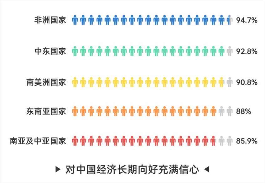 此外,81.3%的受訪(fǎng)者對(duì)于中國(guó)經(jīng)濟(jì)長(zhǎng)期向好充滿(mǎn)信心,較去年上升7.1個(gè)百分點(diǎn),認(rèn)同度排在前五位的分別是非洲國(guó)家受訪(fǎng)者(94.7%)、中東國(guó)家受訪(fǎng)者(92.8%)、南美洲國(guó)家受訪(fǎng)者(90.8%)、東南亞國(guó)家受訪(fǎng)者(88%)和南亞及中亞國(guó)家受訪(fǎng)者(85.9%)。