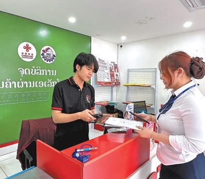 在老撾首都萬象市一處便民服務(wù)點,當?shù)鼐用袷杖≡陔娚唐脚_選購的商品快遞。本報記者 孫廣勇攝