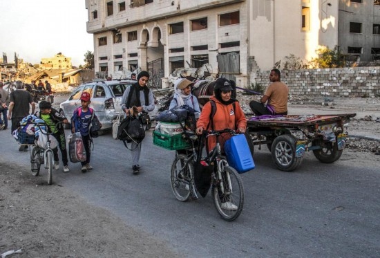 這是10月19日在加沙地帶拍攝的逃離加沙地帶北部杰巴利耶難民營的民眾。新華社發(fā)(馬哈茂德·扎基攝)