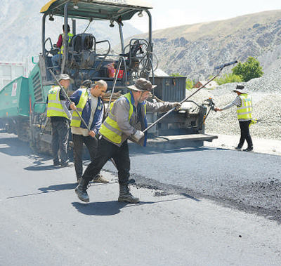 在中塔公路二期建設(shè)項(xiàng)目施工現(xiàn)場(chǎng),工作人員正在鋪設(shè)瀝青。