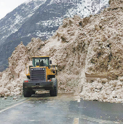 在中塔公路二期建設(shè)項(xiàng)目施工現(xiàn)場(chǎng),裝載機(jī)正在清理路面積雪。