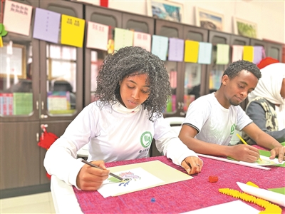亞的斯亞貝巴大學(xué)孔子學(xué)院學(xué)生正在繪制富有中國元素的美術(shù)作品。