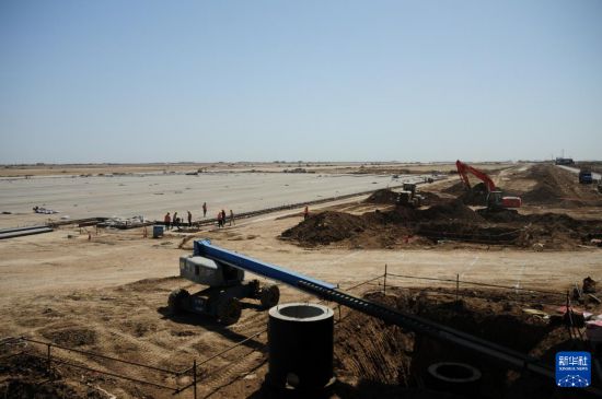 這是4月8日在伊拉克濟加爾省拍攝的由中國建筑集團有限公司承建的納西里耶國際機場項目施工現(xiàn)場。新華社記者 段敏夫 攝