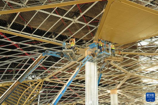 4月8日,建筑工人在伊拉克濟加爾省納西里耶國際機場項目主航站樓內(nèi)部施工作業(yè)。新華社記者 段敏夫 攝