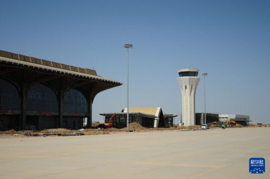 這是4月8日在伊拉克濟加爾省拍攝的由中國建筑集團有限公司承建的納西里耶國際機場項目主航站樓及塔臺。新華社記者 段敏夫 攝