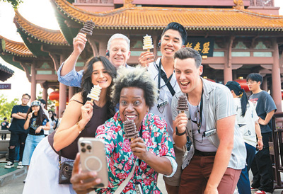外國游客在湖北武漢黃鶴樓前手持文創(chuàng)雪糕拍照。
