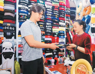 西班牙游客在浙江義烏國際商貿(mào)城用支付寶“碰一下”支付購物。