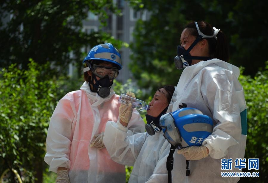 6月16日,北京藍(lán)天救援隊(duì)隊(duì)員在完成對(duì)豐臺(tái)區(qū)一居民區(qū)消殺作業(yè)后休息。連日來,北京出現(xiàn)高溫天氣。酷暑中,工作人員堅(jiān)守抗擊疫情一線,成為烈日下的“逆行者”。新華社發(fā)(陳鐘昊攝)