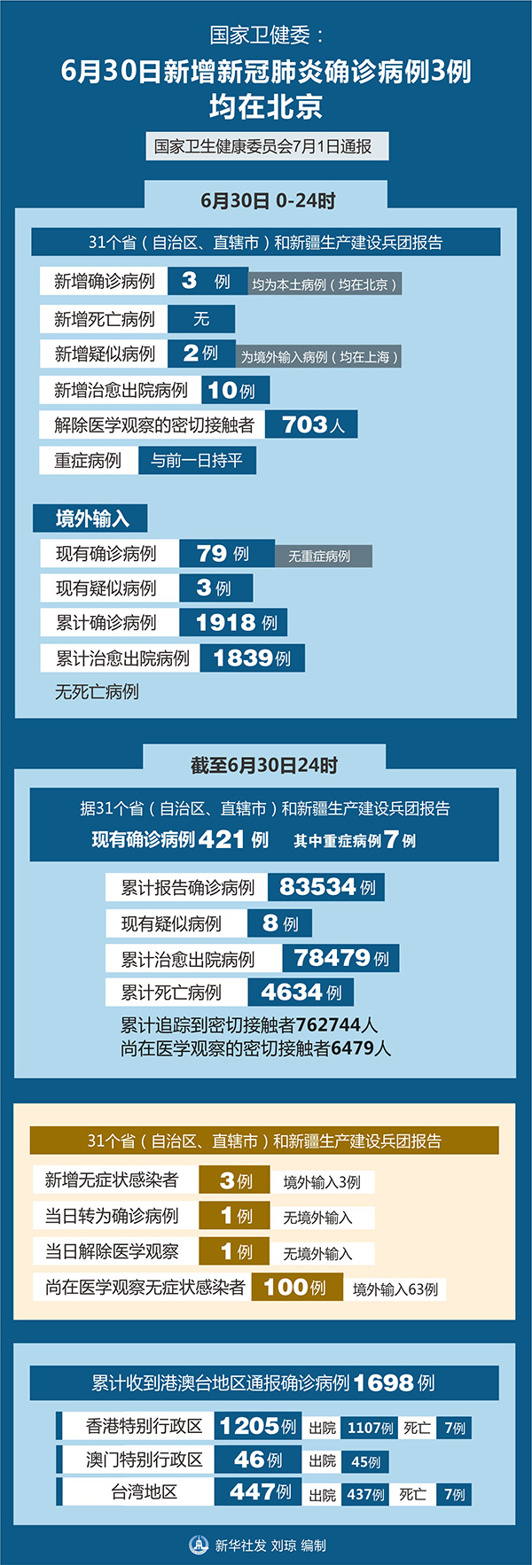新華社北京7月1日電(記者胡喆)國(guó)家衛(wèi)生健康委員會(huì)7月1日通報(bào),6月30日0-24時(shí),31個(gè)省(自治區(qū)、直轄市)和新疆生產(chǎn)建設(shè)兵團(tuán)報(bào)告新增確診病例3例,均為本土病例(均在北京);無(wú)新增死亡病例;新增疑似病例2例,為境外輸入病例(均在上海)。