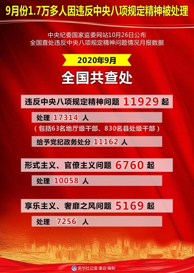 新華社北京10月26日電(記者朱基釵、孫少龍)中央紀(jì)委國(guó)家監(jiān)委網(wǎng)站26日公布全國(guó)查處違反中央八項(xiàng)規(guī)定精神問(wèn)題情況月報(bào)數(shù)據(jù)。通報(bào)顯示,2020年9月,全國(guó)共查處違反中央八項(xiàng)規(guī)定精神問(wèn)題11929起,處理17314人(包括63名地廳級(jí)干部、830名縣處級(jí)干部),給予黨紀(jì)政務(wù)處分11162人。