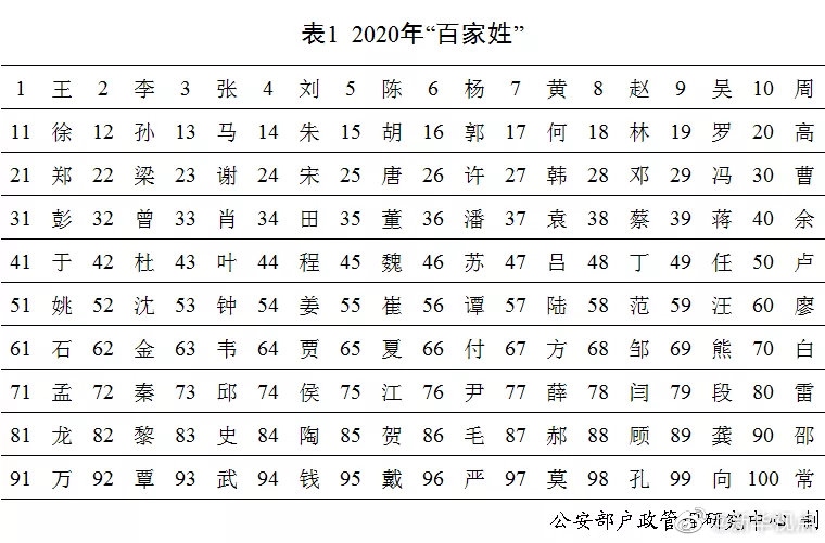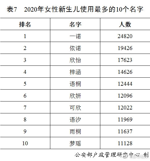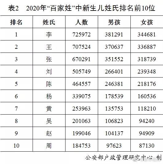 剛剛,公安部戶政管理研究中心二〇二〇年全國姓名報告發(fā)布。按戶籍人口數(shù)量排名,2020年的“百家姓”與2019年相比變化不大。“王”“李”“張”“劉”“陳”依舊名列前五,五大姓氏人口總數(shù)占全國戶籍總?cè)丝诘?0.8%。截止到2020年12月31日,2020年出生并已經(jīng)到公安機關(guān)進行戶籍登記的新生兒共1003.5萬,其中男孩529.0萬,占52.7%,女孩474.5萬,占47.3%。2020年“百家姓”中新生兒登記姓氏最多的是“李”,共72.6萬人。2020年出生并已經(jīng)進行戶籍登記的女性新生兒中,使用頻率最高的10個名字依次為:“一諾”“依諾”“欣怡”“梓涵”“語桐”“欣妍”“可欣”“語汐”“雨桐”“夢瑤”。與2019年相比,“一諾”“依諾”“欣怡”依舊位列三甲,“語桐”“可欣”“語汐”“夢瑤”進入前十。(記者 熊豐、任沁沁)