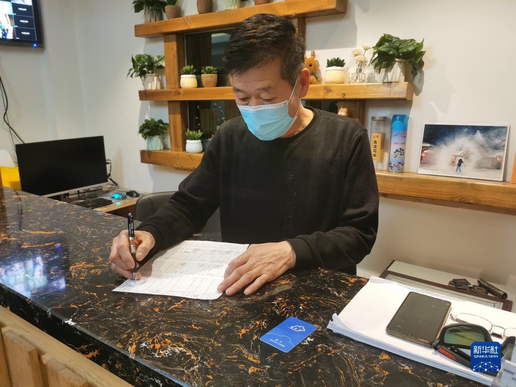 這是2021年1月8日,在黑龍江雪鄉(xiāng),民宿老板樊兆義在柜臺前核對住客信息。新華社記者 王君寶 攝
