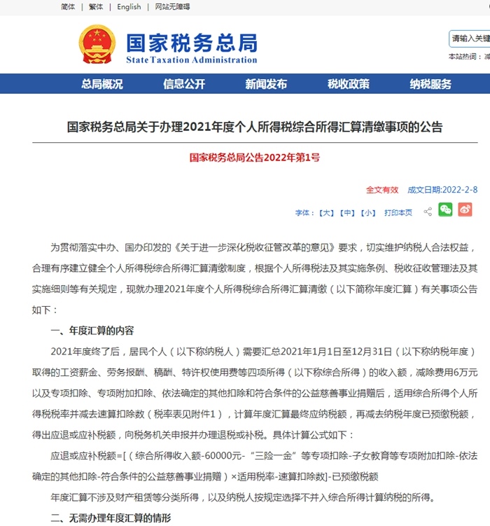 為貫徹落實中辦、國辦印發(fā)的《關(guān)于進一步深化稅收征管改革的意見》要求,切實維護納稅人合法權(quán)益,合理有序建立健全個人所得稅綜合所得匯算清繳制度,根據(jù)個人所得稅法及其實施條例、稅收征收管理法及其實施細則等有關(guān)規(guī)定,現(xiàn)就辦理2021年度個人所得稅綜合所得匯算清繳(以下簡稱年度匯算)有關(guān)事項公告如下: