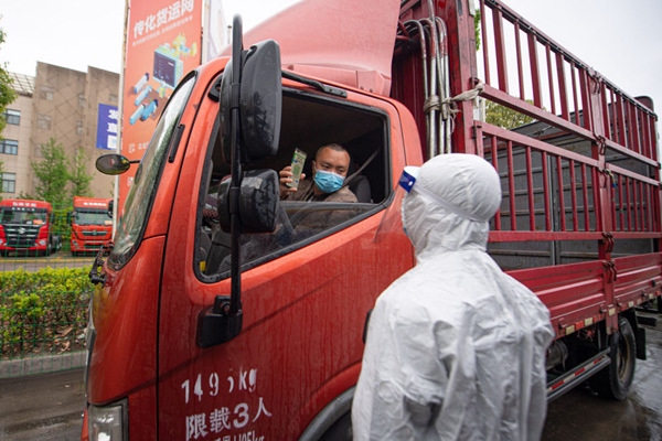4月13日,工作人員查驗(yàn)駛?cè)牒贾輦骰犯鄣呢涇?chē)司機(jī)健康碼。新華社記者江漢攝