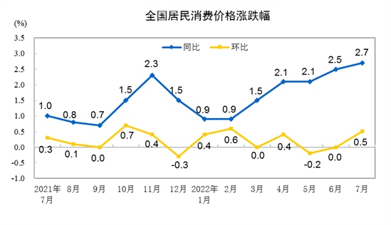 2022年7月份,全國居民消費(fèi)價格同比上漲2.7%。其中,城市上漲2.6%,農(nóng)村上漲3.0%;食品價格上漲6.3%,非食品價格上漲1.9%;消費(fèi)品價格上漲4.0%,服務(wù)價格上漲0.7%。1--—7月平均,全國居民消費(fèi)價格比上年同期上漲1.8%。