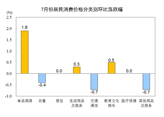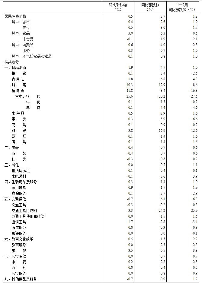 7月份,全國居民消費(fèi)價格環(huán)比上漲0.5%。其中,城市上漲0.4%,農(nóng)村上漲0.5%;食品價格上漲3.0%,非食品價格下降0.1%;消費(fèi)品價格上漲0.6%,服務(wù)價格上漲0.3%。