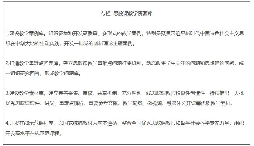 19.全面推進課程思政高質(zhì)量建設。教育部組建高等學校課程思政教學指導委員會,研制普通本科專業(yè)類課程思政教學指南,組織開展高校教師課程思政教學能力培訓,建設一批課程思政系列共享資源庫。建成一批課程思政示范高校,推出一批課程思政示范課程,選樹一批課程思政教學名師和團隊,建設一批高校課程思政教學研究示范中心。加強中小學學科德育建設。