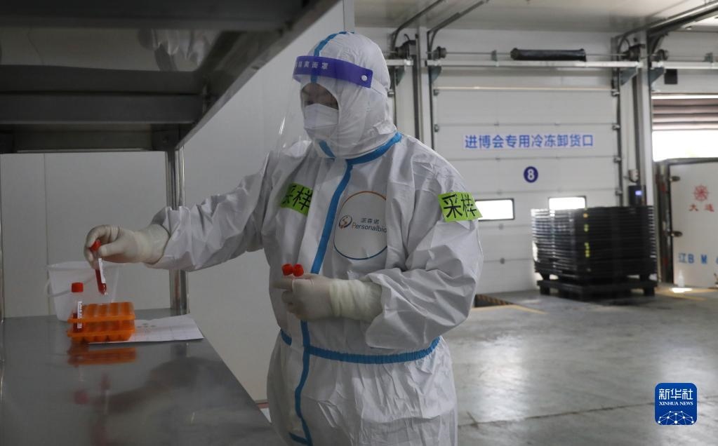 10月20日,一名核酸采樣工作人員在放置入倉的冷鏈?zhǔn)称氛蛊泛怂針颖尽P氯A社記者 方喆攝