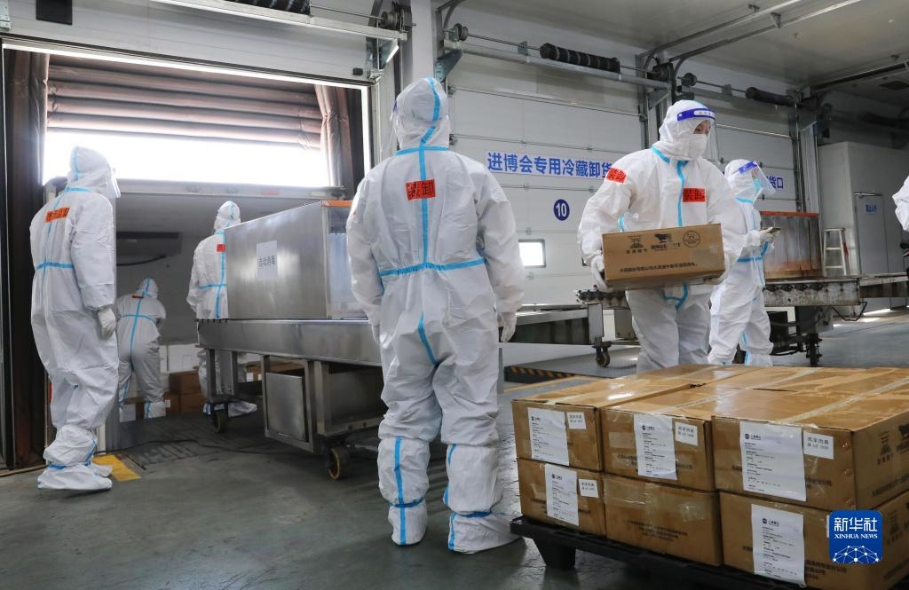 記者在現(xiàn)場看到,當(dāng)運輸進口冷鏈?zhǔn)称氛蛊返能囕v到達后,工作人員馬上對司機進行健康碼核驗和體溫檢測,并對車輛進行消毒。裝卸過程中,司機實行“非必要不下車”。貨物入庫時,在完成外包裝消毒后,工作人員將展品拆除外包裝,對內(nèi)里的小包裝進行消毒、核酸檢測,再重新裝箱、貼標(biāo)簽、放入暫存庫,之后再轉(zhuǎn)入合格儲存庫。