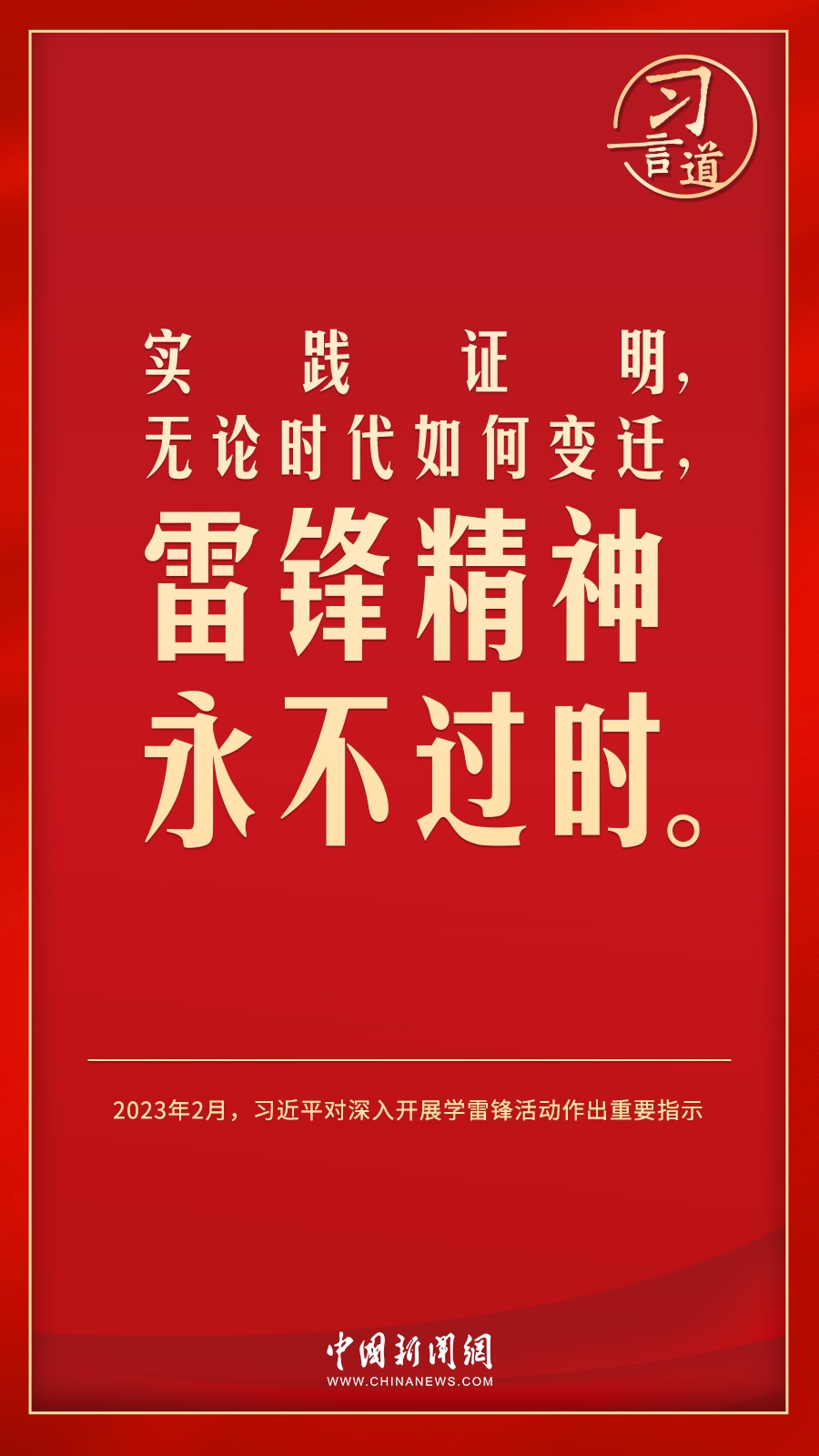 今年是毛澤東等老一輩革命家為雷鋒同志題詞60周年。黨的十八大以來(lái),習(xí)近平總書記就學(xué)習(xí)弘揚(yáng)雷鋒精神多次作出重要指示,他強(qiáng)調(diào),無(wú)論時(shí)代如何變遷,雷鋒精神永不過(guò)時(shí)。