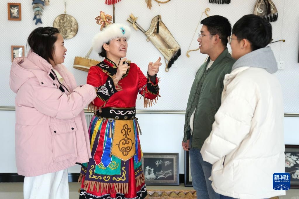 2月23日,在黑龍江省同江市八岔赫哲族鄉(xiāng)八岔村伊瑪堪傳習(xí)所,劉蕾(左二)與年輕人交流。新華社記者 王建威 攝